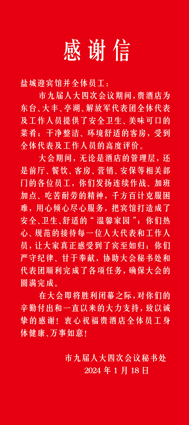 本次服務保障工作的圓滿完成,為酒店接待工作進一步積累了寶貴經驗,也檢驗了全體員工的專業素養和職業技能。會后,大會秘書處、解放軍代表團、亭湖代表團、大豐代表團、東臺代表團等紛紛發來感謝信共計76封,對酒店接待服務保障工作給予高度評價。鹽城迎賓館將認真總結成功經驗,牢固樹立“服務第一、品牌優先”的經營理念,不斷在優化服務品質和服務細節上下功夫,持續提升管理水平和服務質量。