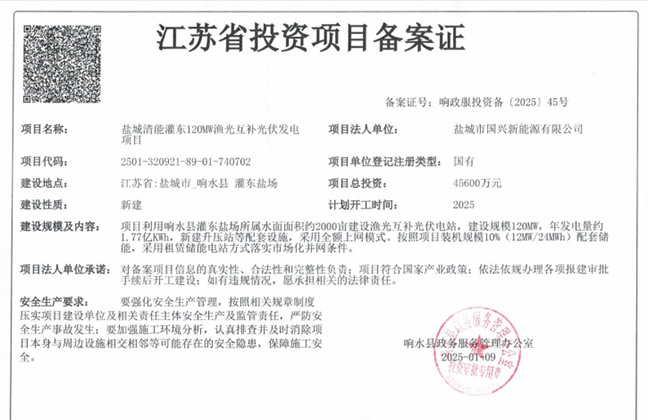 國能公司持續優化市場布局,聚焦業務拓展,積極整合資源,緊盯優質項目,利用濱海縣八灘鎮330畝坑塘水面建設漁光互補光伏電站,規劃裝機容量18MWp;與灌東鹽場公司合作,利用響水灌東鹽場約2000畝坑塘水面,開發建設120MW漁光互補光伏電站。目前2個項目已取得投資備案證,進入省發改委光伏發電項目實施庫,正在積極推進項目前期各項工作,預計今年年底開工建設。