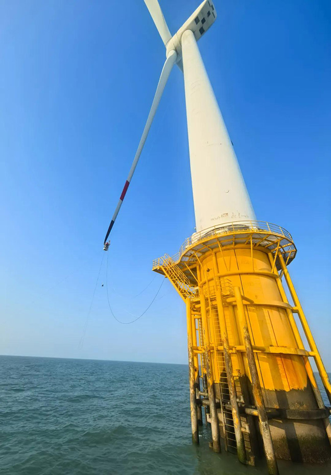 葉片前緣腐蝕每年可能造成發電量損失5%,有時可能損失25%以上,“葉片飛人”的消缺任務非常重要。正是這些 “葉片飛人”在高溫下的堅守,及時排查并消除了風機葉片的故障隱患。他們是風機葉片的“守護神”,用汗水和專業在烈焰高空詮釋著責任和擔當,用實際行動保障了海上風機的穩定運行,為迎峰度夏的電力供應筑牢了防線,為清潔能源的高效利用貢獻著自己的力量。